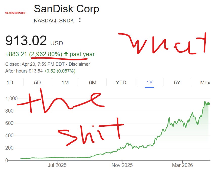 I find it funny people don’t talk about memory MORE. So basically one could have invested $30k in Sandisk last year and be a millionaire today lmaooooo.