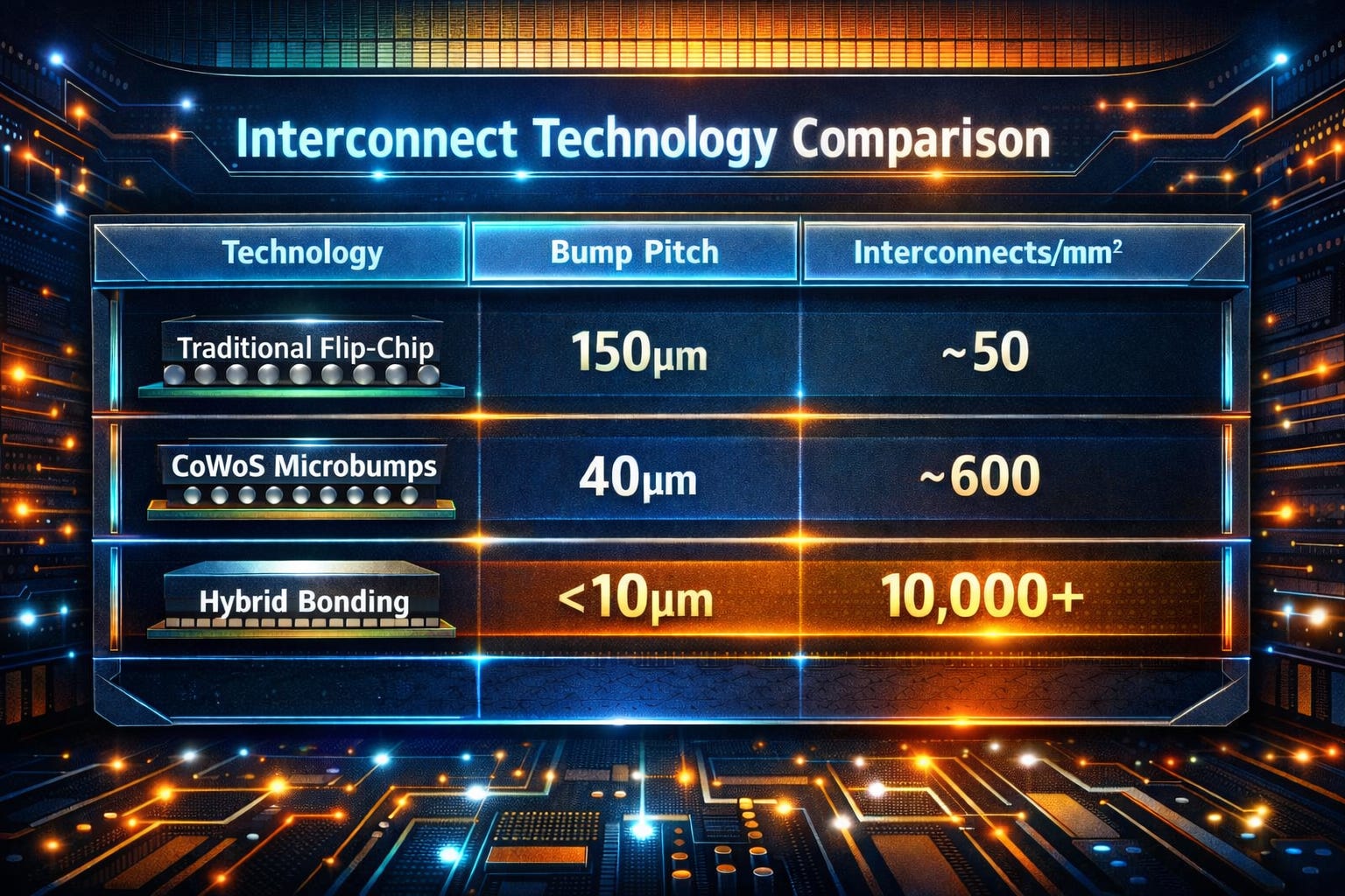 Density: Sub-10μm pitch means 10,000+ interconnects per mm². This is because the solder balls in non-hybrid-bonding packaging techniques are spheres that bulge around the edge, capping how dense they can be packed without touching and shorting each other.