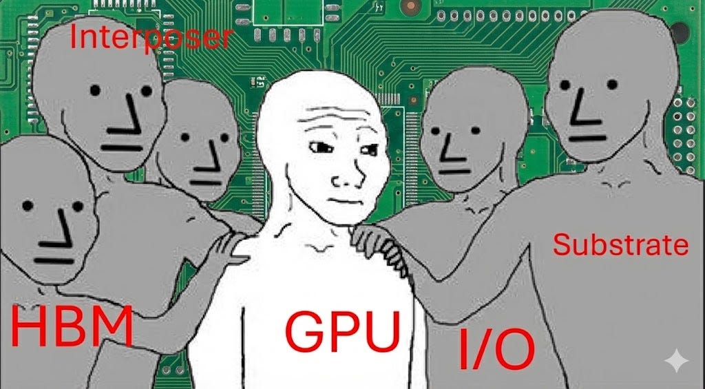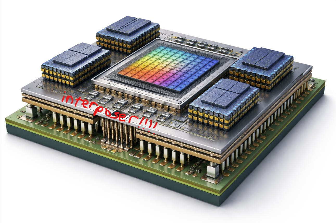Place multiple chips side-by-side on a silicon “interposer,” a piece of silicon that sits under the chips but ISN’T a chip itself, essentially a passive routing layer that connects them with incredibly dense wiring. This is how NVIDIA connects its GPU die to HBM memory stacks in every AI accelerator you’ve heard of.