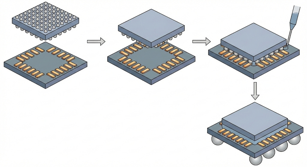 Instead of wires on top, flip the chip face down and connect it directly to the package through tiny solder bumps on the face. More connections, shorter paths, better performance. This is still the workhorse for most processors.