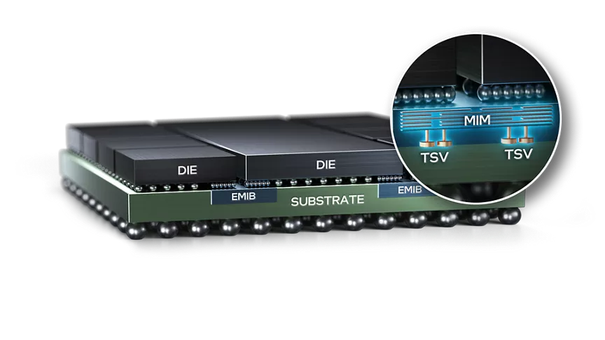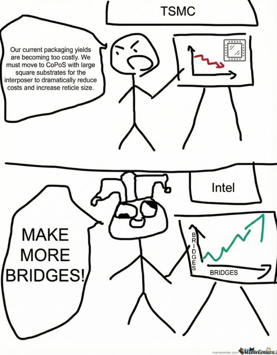 An alternative approach that I personally really like is Intel’s EMIB. CoWoS wastes a lot of silicon. Silicon is expensive and only needed where the data actually has to travel, so why don’t we only use silicon there, and organic substrate everywhere else that doesn’t require these silicon “bridges?”