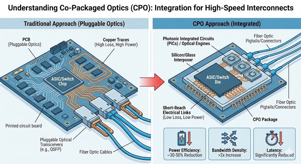 However, as we approach the physical limits of physics, copper is hitting a wall. At the blistering speeds of 1.6T and beyond per lane, copper cables become too thick, too heavy, and lose too much signal over even short distances. To maintain the bandwidth required for next-generation clusters, the connection must switch from electricity to light. But you cannot simply jam thousands of standard pluggable transceivers around a GPU; they are too bulky and power-hungry to support that level of density. The industry’s solution is Co-Packaged Optics (CPO): moving the optical engine off the faceplate and placing it directly onto the chip package, millimeters from the GPU. While CPO is currently a necessity for these massive Scale Up architectures, it is worth noting that as bandwidth demands continue to double, this density advantage will eventually force Scale Out Ethernet systems to adopt CPO as well, likely at the 3.2T or 6.4T generation.