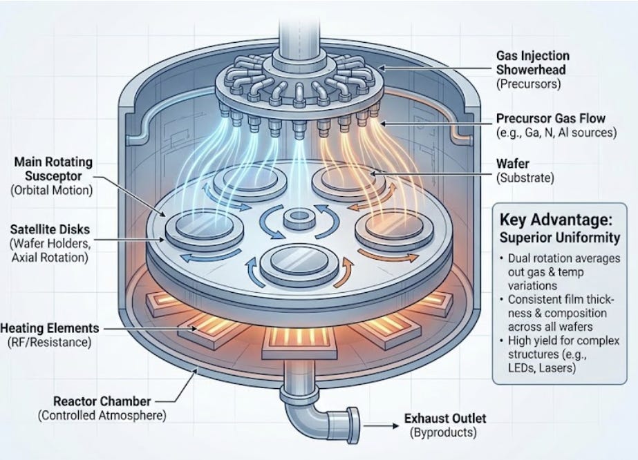 However, Optoelectronics (Lasers and MicroLEDs) requires a level of precision that standard tools simply cannot match. Aixtron’s proprietary Planetary Reactor technology uses a “dual-rotation” mechanism where the wafers orbit the center of the chamber while simultaneously spinning on their own axis. This creates a specific gas flow dynamic that achieves near-perfect uniformity across hundreds of layers of Indium Phosphide (InP) or Gallium Arsenide (GaAs).