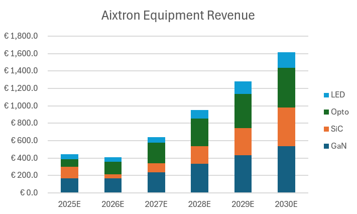 Our model shows total equipment revenue reaching 1.6 billion euros by 2030. The contribution from GaN, Optoelectronics, and SiC are similar after SiC recovers from its trough.