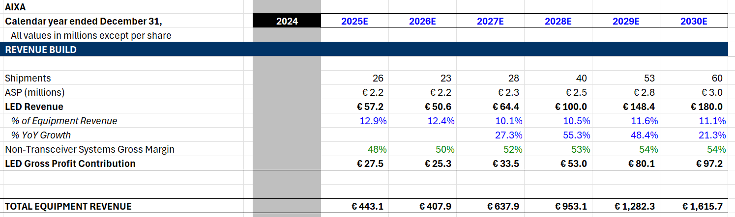 We model steady ASP increases throughout the forecast period. Due to Aixtron’s monopoly and optical networking becoming the hard bottleneck for AI scaling, customers like Lumentum and Tower are not price-sensitive on these tools. They will pay a premium for the G10-AsP platform because it is the only tool that guarantees the uniformity needed for UHP lasers. Accordingly, we model Gross Margins expanding to the mid-to-high 50s.