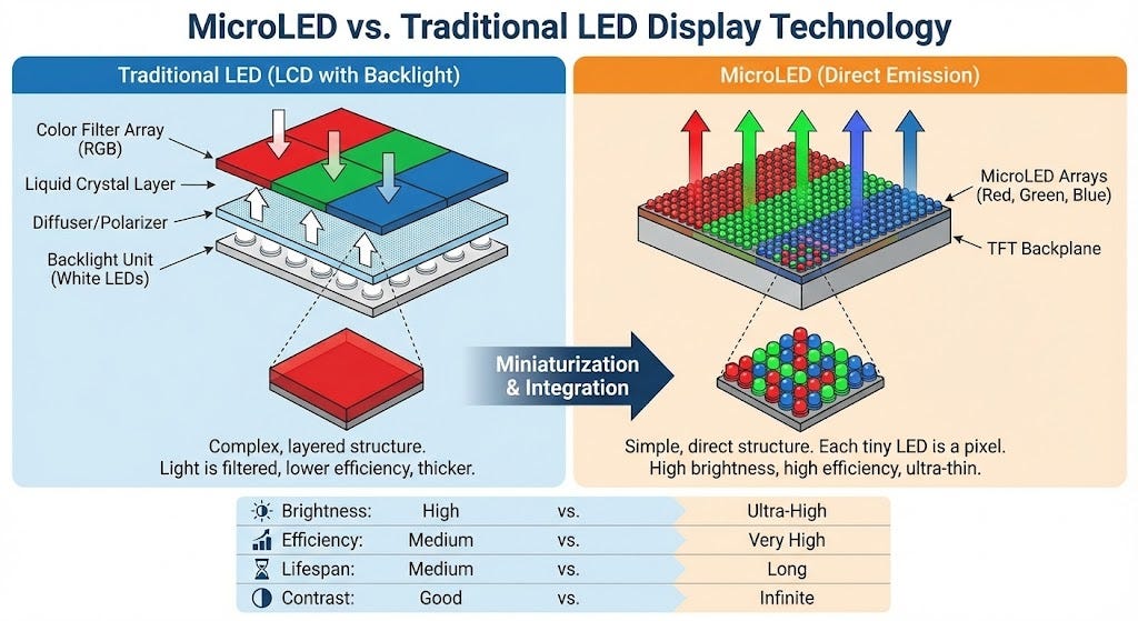 The “Killer App” for MicroLED is Augmented Reality (AR) and wearables. If you are building smart glasses (like the eventual “Apple Glasses”), you have a physics problem: you need a display that is transparent, yet bright enough to compete with the actual sun when you walk outside. OLED cannot get bright enough without melting the battery or burning out the screen. MicroLED is the only technology capable of delivering “daylight brightness” in a microscopic footprint with all-day battery life.
