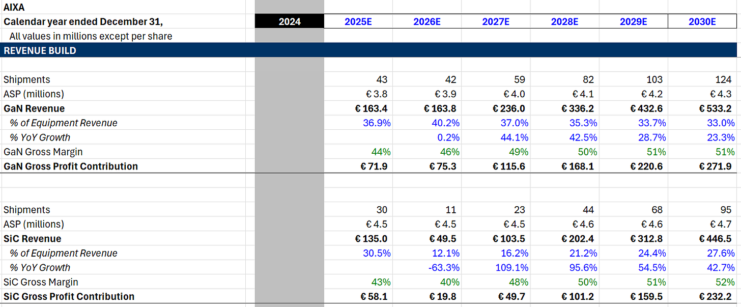 For the SiC segment, our model reflects a “U-shaped” recovery that acknowledges the current overcapacity while preparing for the inevitable upgrade cycle. We model massive digestion in the near term, in line with the most bearish street estimates. We have significantly cut SiC revenue expectations, modeling it to drop below 15% of total equipment revenue during this period. We also model flat ASPs as utilization rates at 150mm fabs remain low (20–30%). However, in 2028+, we model a sharp resurgence. This is not driven by capacity expansion, but by the 200mm transition. As fabs retire 150mm lines to capture the ~50% die cost reduction offered by 200mm wafers, they must purchase new compatible equipment. We also explicitly model Aixtron’s market share growing from 35% today to 40–50% by 2030. This is based on the physics of the G10-SiC batch tool, which offers superior economics on 200mm wafers compared to single-wafer competitors. Consequently, we model SiC gross margins troughing at 40% during the 2026 price wars, before recovering to 52% by the end of the decade as the premium G10 platform becomes the industry standard.