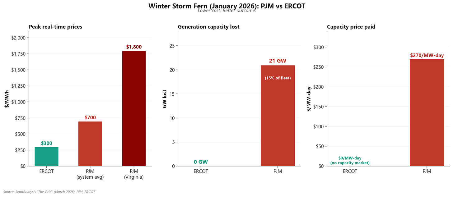 Lower cost, better outcome. ERCOT’s market discipline delivered what PJM’s $16 billion in capacity payments could not.