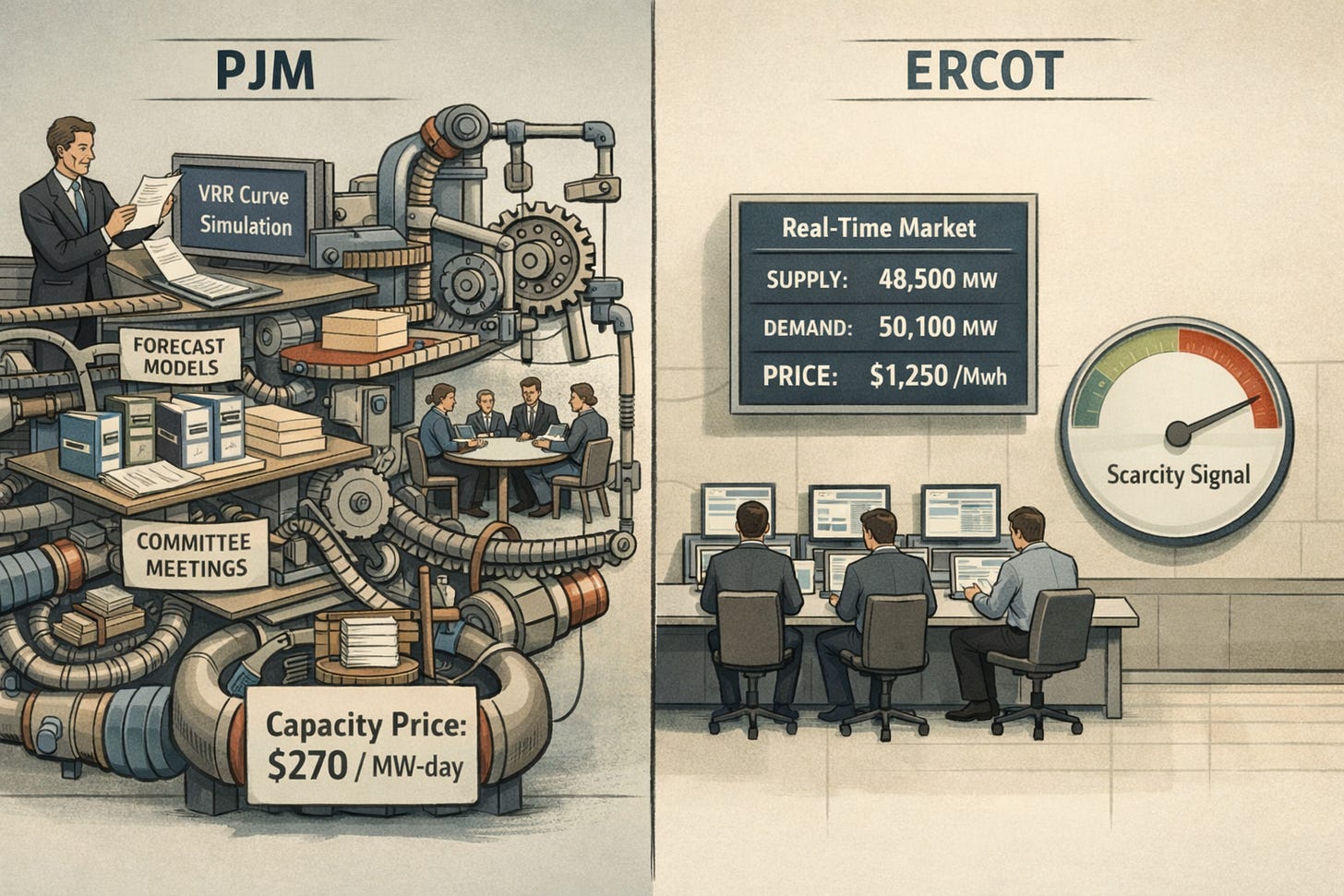 PJM has both spot and capacity markets. ERCOT has only an energy market. This single structural difference drives a massive divergence in outcomes, prices, and incentives. It is the most important distinction in the entire US power landscape for understanding what comes next.