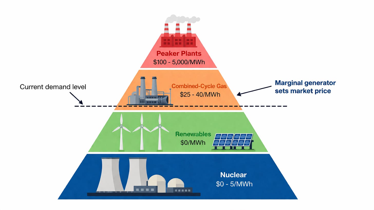 The marginal generator (the last plant dispatched to meet demand) sets the price for the entire market in that hour. When demand is low, a CCGT sets the price at $25-40/MWh. When demand spikes, a peaker sets it at $100+ or even $5,000/MWh in extreme cases.