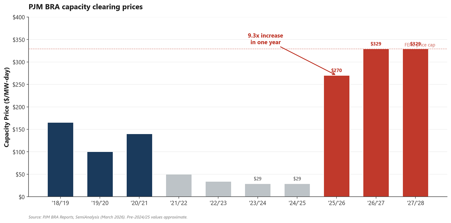 In the 2024/25 delivery period, capacity cost $29/MW-day. In the 2025/26 delivery period, it jumped to $270/MW-day. That is a 9.3X INCREASE in a single year. Some locations hit $450/MW-day. The subsequent 2026/27 and 2027/28 auctions both cleared at the federal price cap of $329/MW-day, because regulators imposed a ceiling after the initial shock.