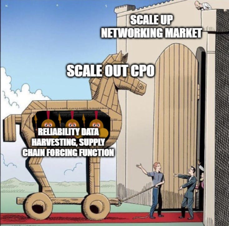 Scale-out CPO acts as the guinea pig for the eventual scale-up endgame, serving two critical functions: building the reliability database and readying the supply chain.